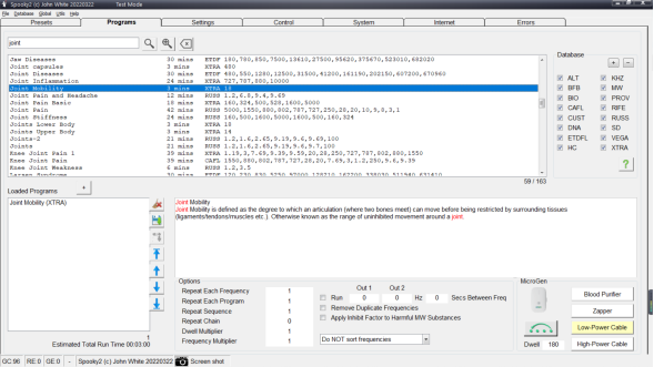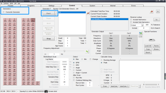 以 Spooky2 PEMF 模式為例,轉到預設選項卡,選擇 Shell (Empty) Presets > Spooky2 Coil (Generator Direct) > JW。 然後,轉到“程序”選項卡,搜索“joint”,然後選擇您想要的程序。 最後,轉到控制選項卡,選擇您的生成器端口,勾選“Overwrite”,然後單擊“Start”按鈕開始。