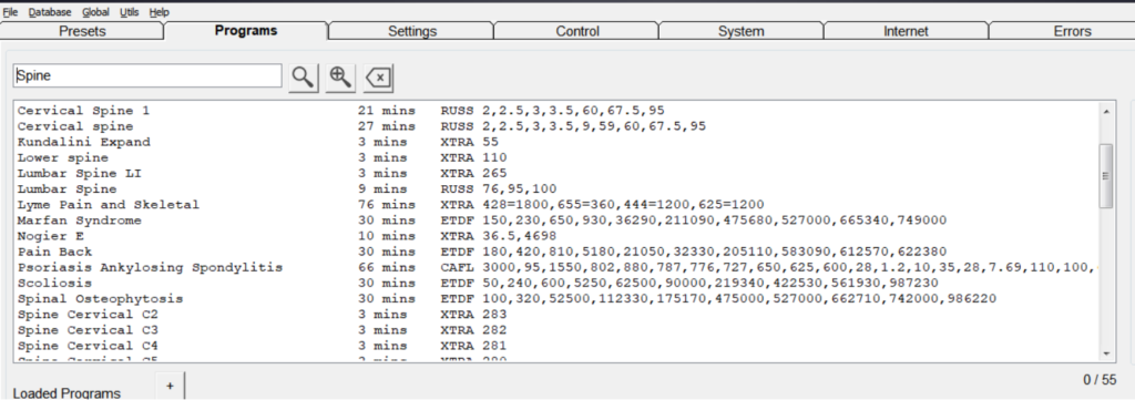 1. Contact mode: Put the Spooky2 Tens Pads on both sides of the spine, and then select the appropriate frequency to run from the Spooky2 software, you can type keywords in the “Preset/Program” tab to find these frequencies, such as “pain” and “spine” etc., select the correct Contact – Healing Shell Preset to run them.