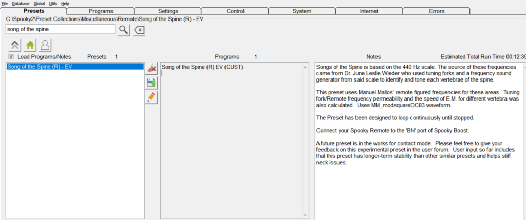 2. Remote mode: Remote mode is an ideal transmission mode for those who travel frequently or want to help relatives far away. Here we recommend a very popular preset – Song of the Spine (R) EV (CUST) , the Song of the Spine preset is based on the 440 Hz scale, these frequencies are sourced from June Leslie Wieder Dr., who uses a tuning fork and a frequency sound generator with a 440 Hz scale to identify and tune each vertebra of the spine, this preset uses Manuel Mallos’ remote digital frequencies. Connect your Spooky2 Remote to the “BN” port of the Spooky2 Boost and load the preset into your generator run.